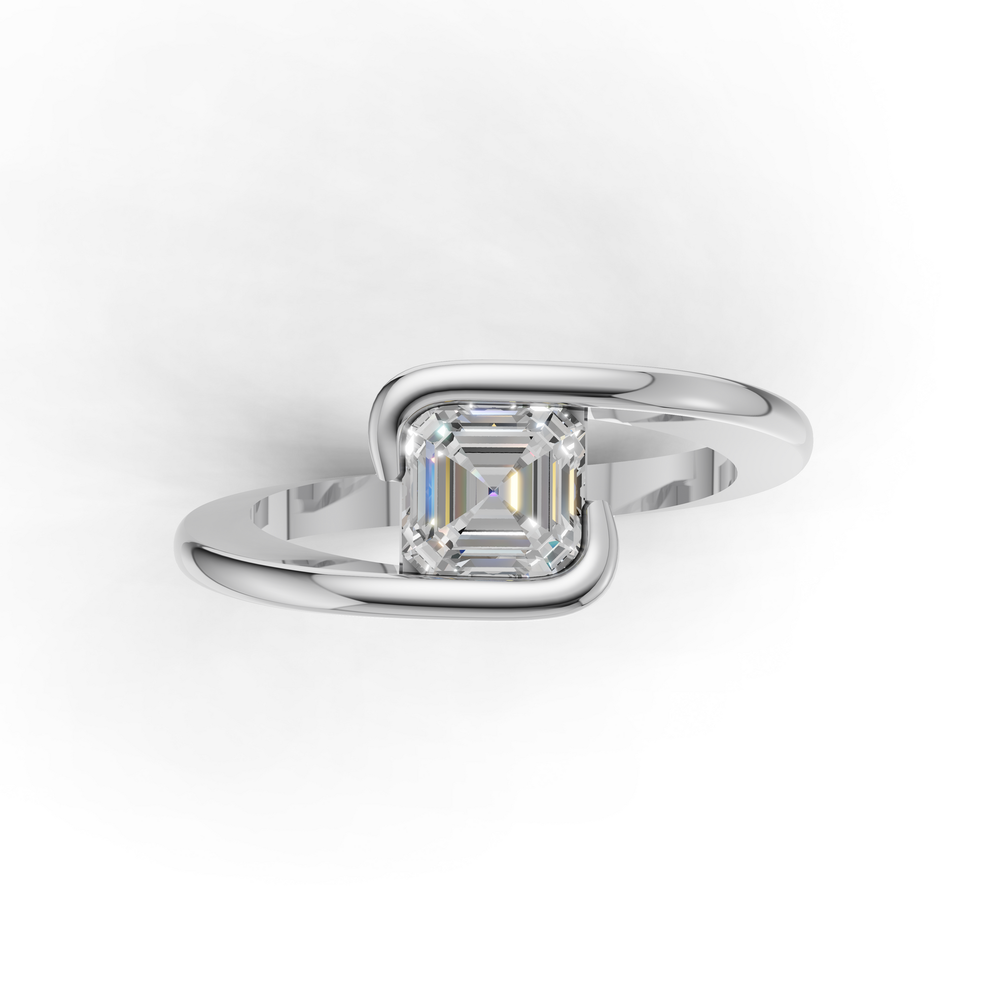 A refined Asscher cut diamond solitaire ring featuring a unique twist band that elegantly frames the center stone. Perfect for modern minimalists who appreciate sleek design and timeless beauty. Ideal as an engagement or statement ring.